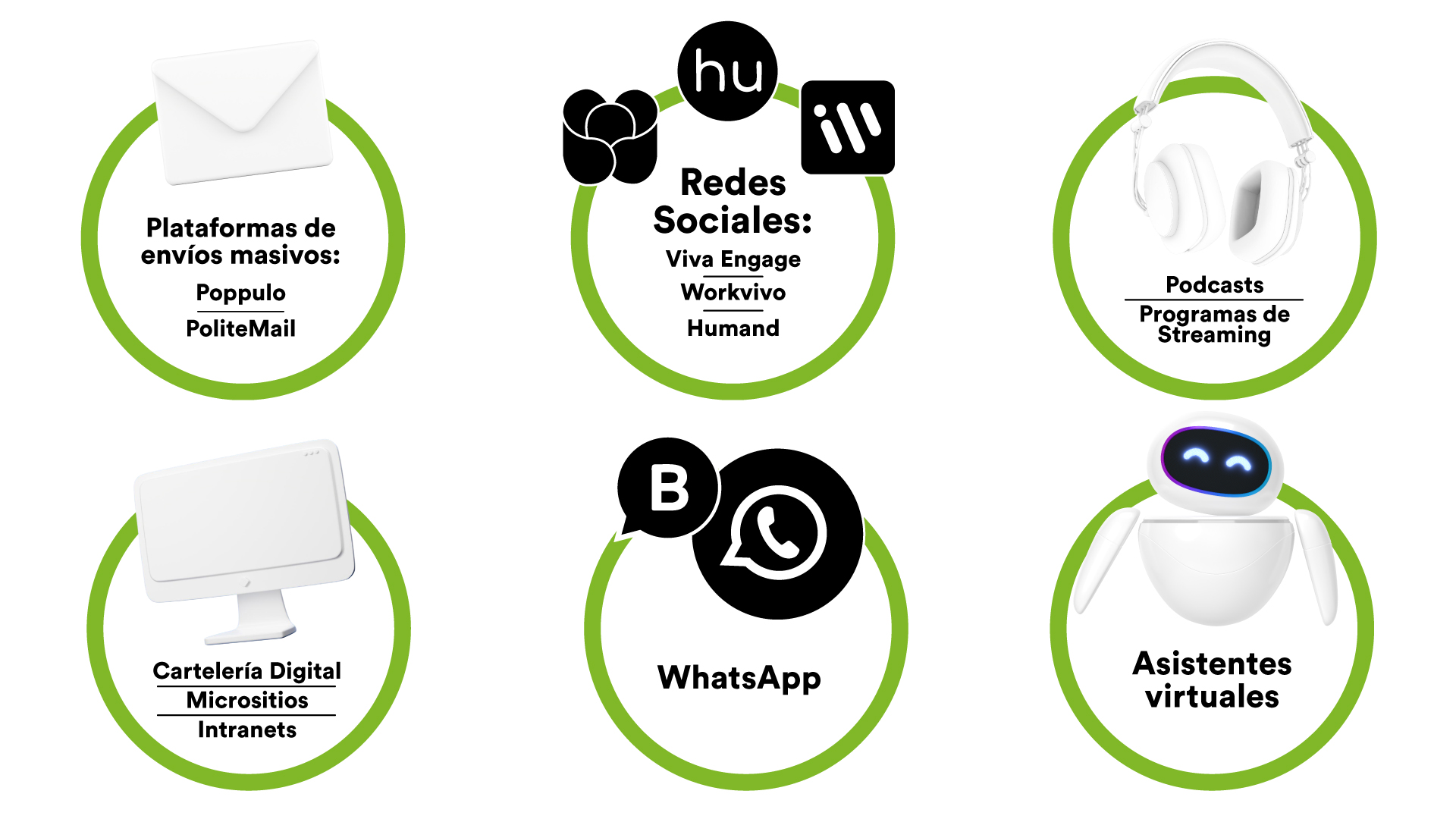 Desde canales tradicionales como mailing, newsletters, intranet o carteleras digitales hasta herramientas colaborativas (redes), apps internas o canales presenciales.